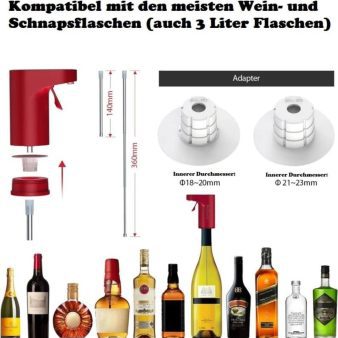 The wine dispenser is suitable for different bottle openings with three different sized adapter silicone stoppers. The diameter of silicone stoppers is 18mm-20mm, 20mm-23mm (other caliber bottle mouths are not suitable). Retractable straw to fit 165mm-385mm glass height; can serve sake, whiskey pump, shochu, fruit wine, rice wine, spirits and wine.